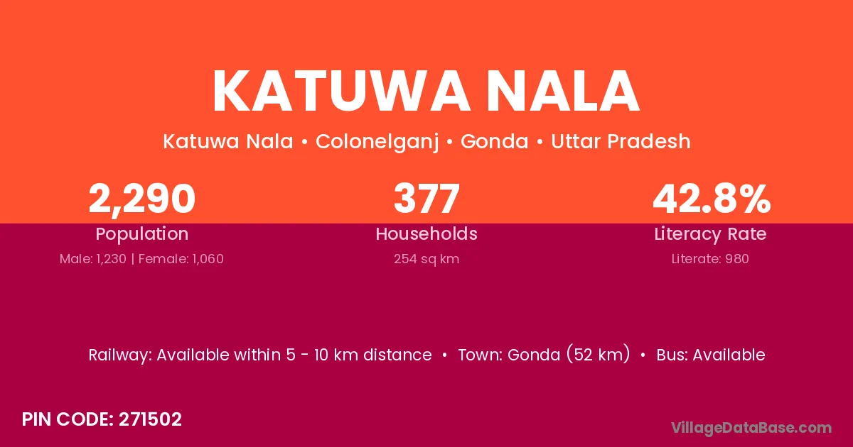 Gonda (52 km) is the nearest town to Katuwa Nala village for major economic activities and is located approximately 52 km away.