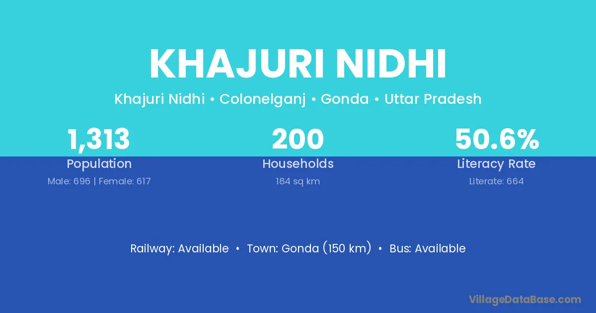Gonda (150 km) is the nearest town to Khajuri Nidhi village for major economic activities and is located approximately 150 km away.