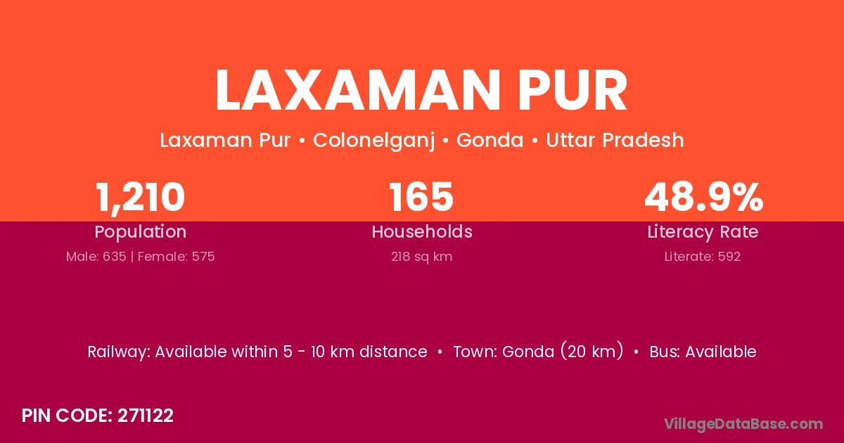 Gonda (20 km) is the nearest town to Laxaman Pur village for major economic activities and is located approximately 20 km away.