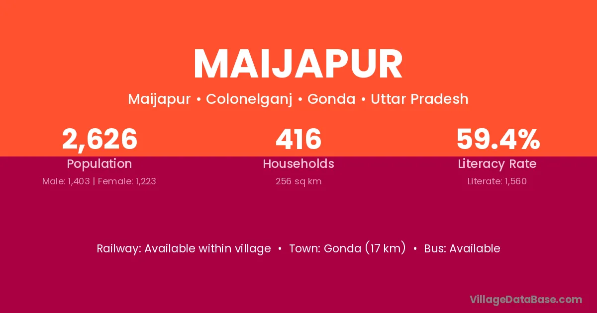Gonda (17 km) is the nearest town to Maijapur village for major economic activities and is located approximately 17 km away.