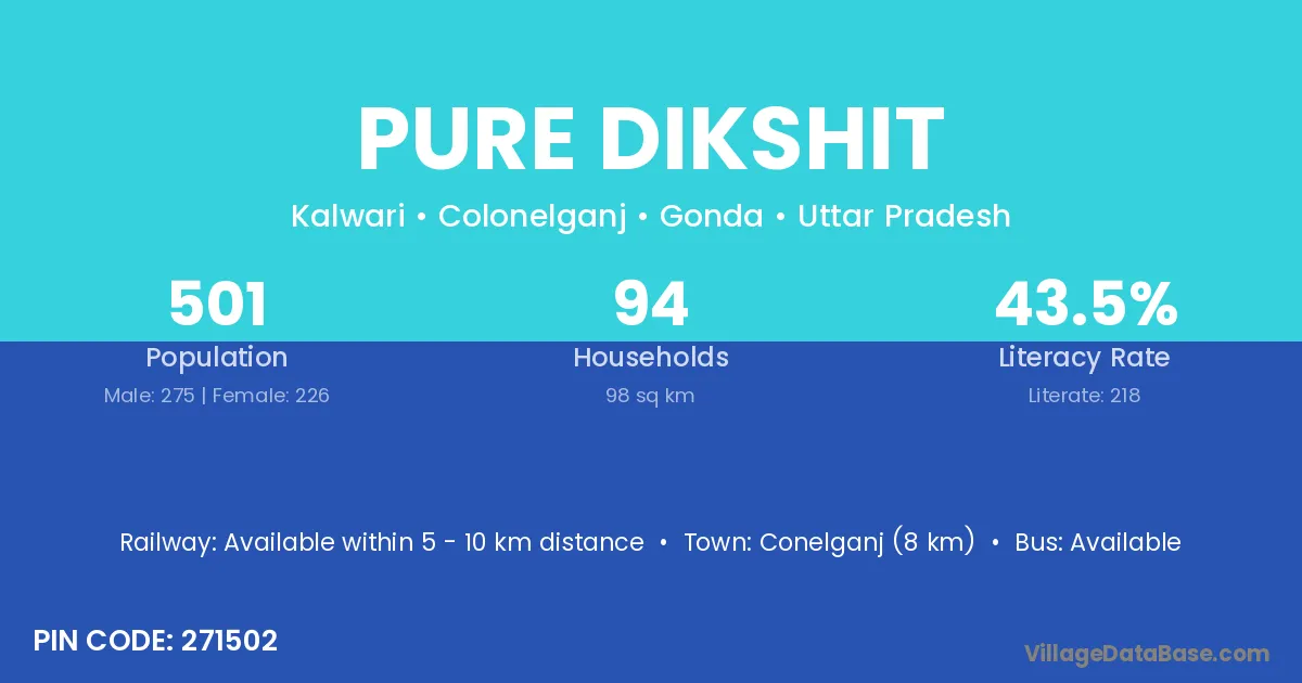 Pure Dikshit village has a total population of 501 people, of which 275 are males and 226 are females.