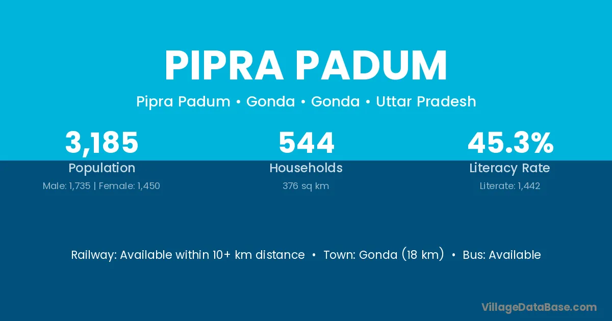 Gonda (18 km) is the nearest town to Pipra Padum village for major economic activities and is located approximately 18 km away.