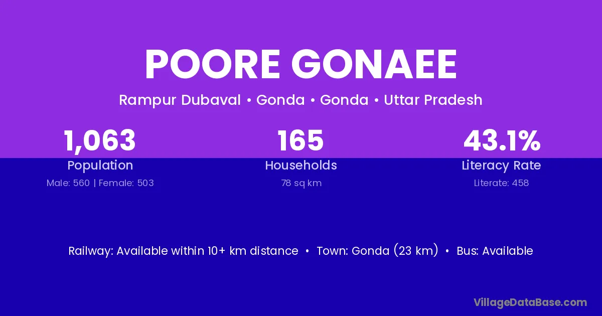 Gonda (23 km) is the nearest town to Poore Gonaee village for major economic activities and is located approximately 23 km away.