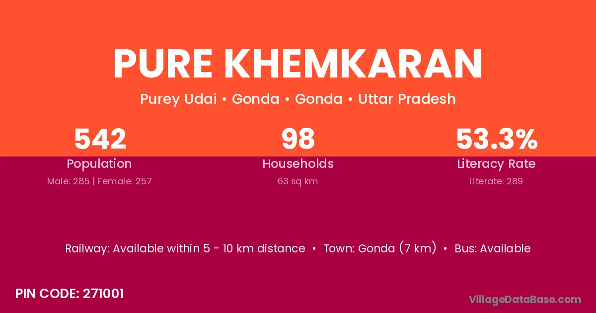 Gonda (7 km) is the nearest town to Pure Khemkaran village for major economic activities and is located approximately 7 km away.