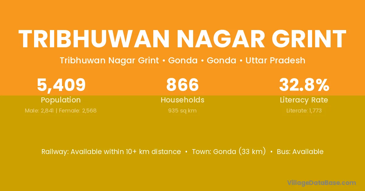 Gonda (33 km) is the nearest town to Tribhuwan Nagar Grint village for major economic activities and is located approximately 33 km away.