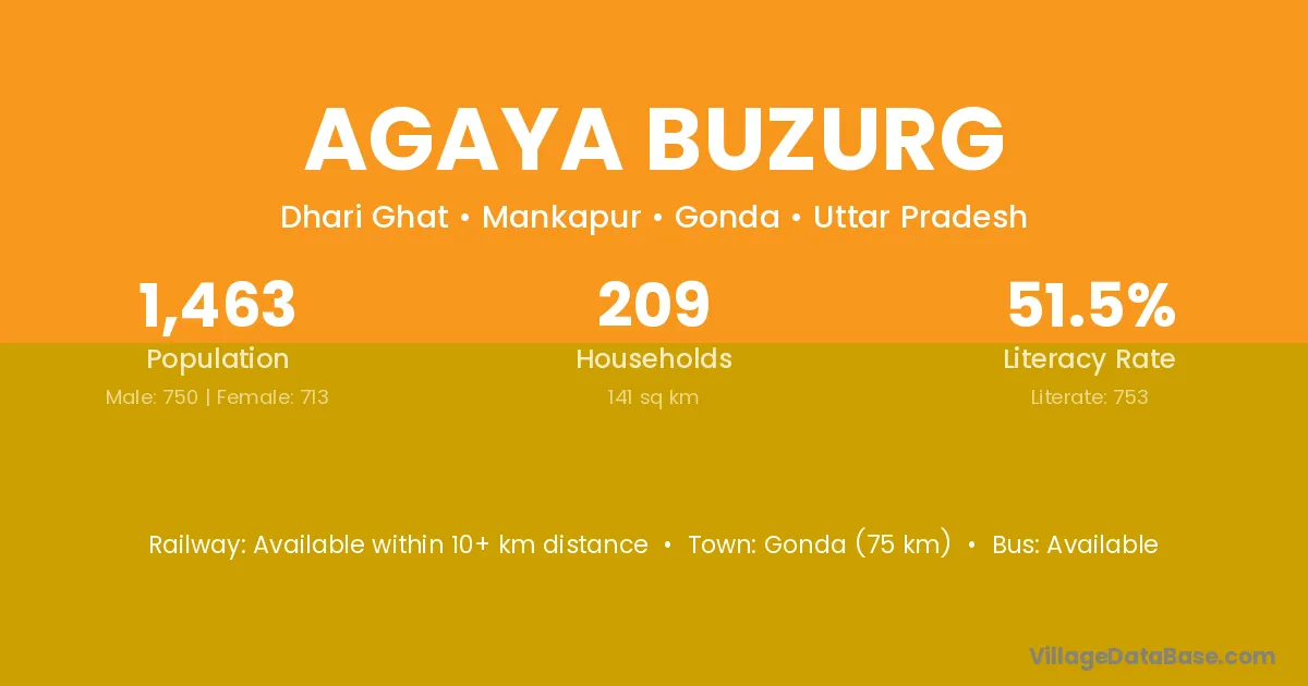 Gonda (75 km) is the nearest town to Agaya Buzurg village for major economic activities and is located approximately 75 km away.