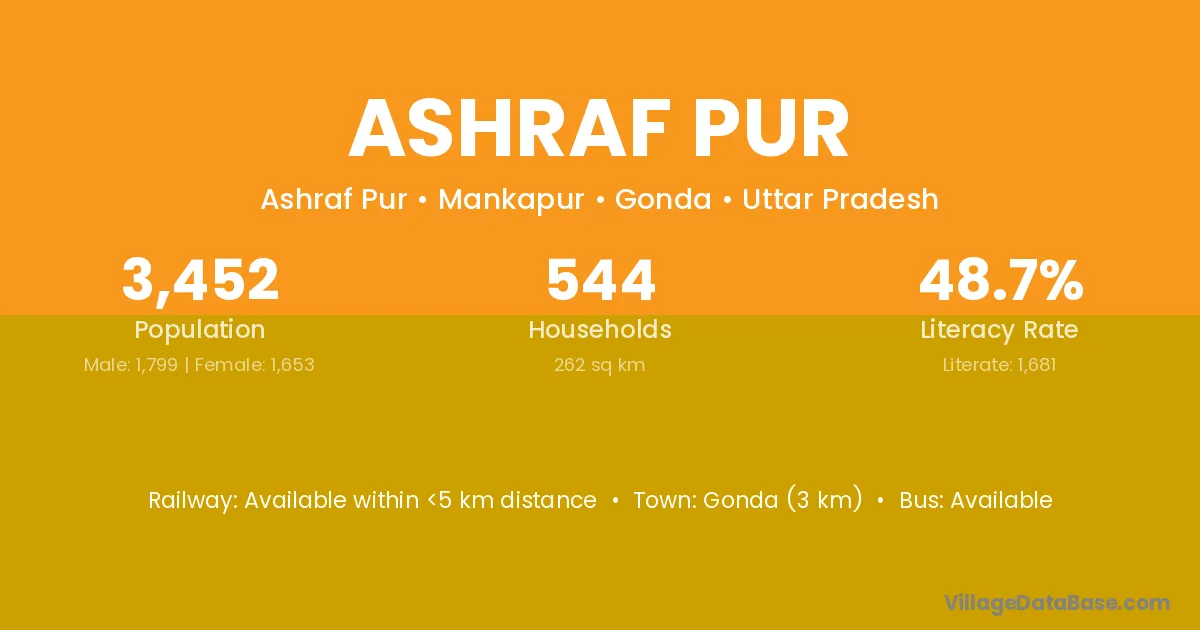 Gonda (3 km) is the nearest town to Ashraf Pur village for major economic activities and is located approximately 3 km away.