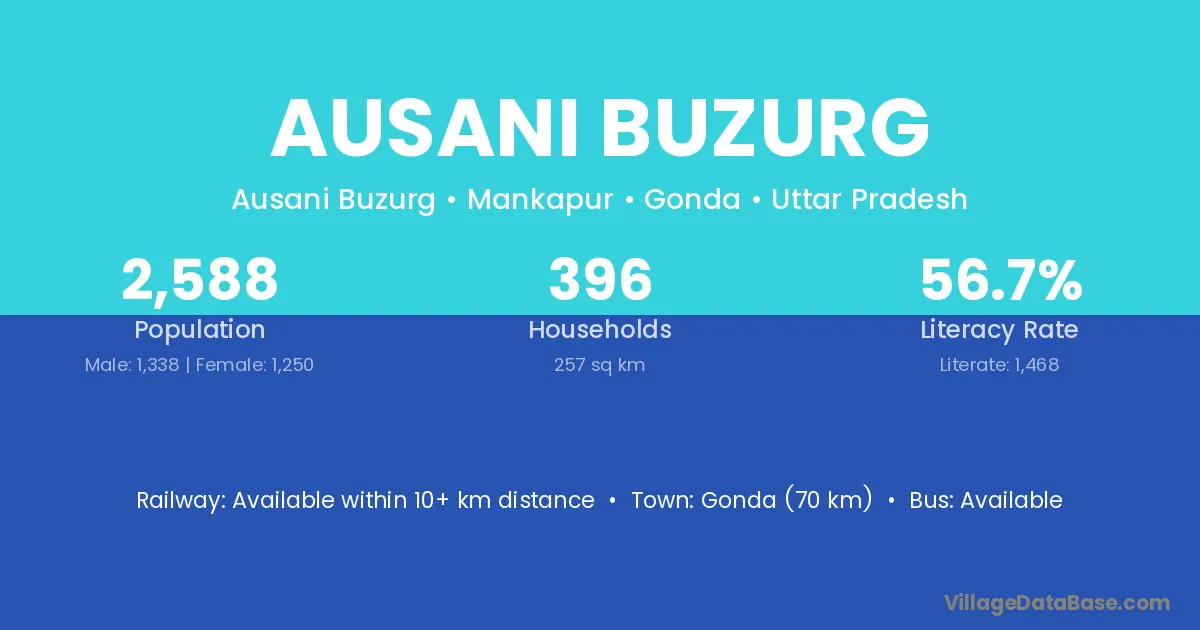 Gonda (70 km) is the nearest town to Ausani Buzurg village for major economic activities and is located approximately 70 km away.