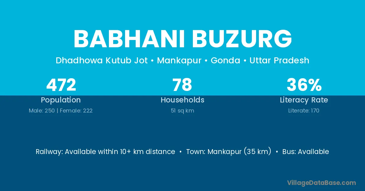 Mankapur (35 km) is the nearest town to Babhani Buzurg village for major economic activities and is located approximately 35 km away.