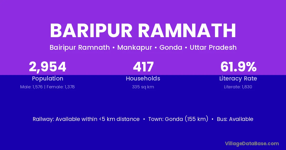Gonda (155 km) is the nearest town to Baripur Ramnath village for major economic activities and is located approximately 155 km away.