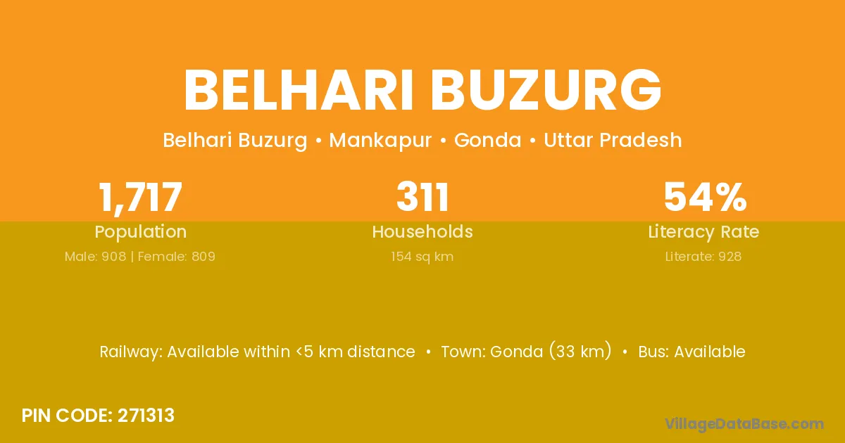 Gonda (33 km) is the nearest town to Belhari Buzurg village for major economic activities and is located approximately 33 km away.