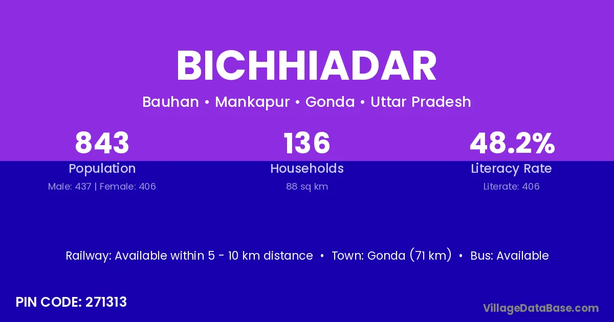 Gonda (71 km) is the nearest town to Bichhiadar village for major economic activities and is located approximately 71 km away.