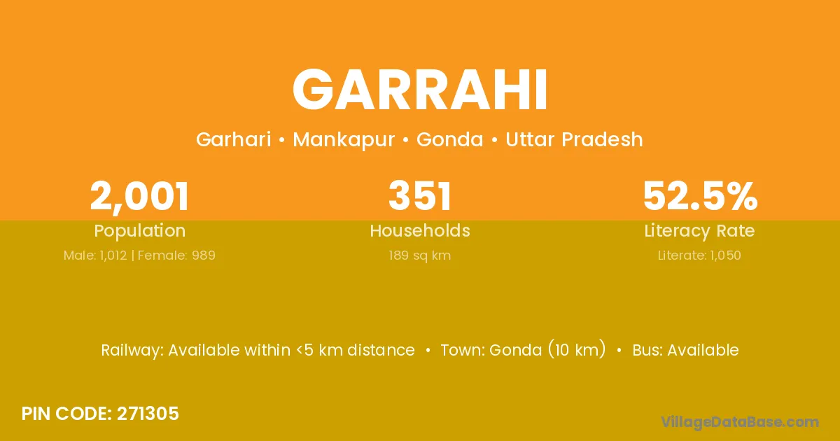 Gonda (10 km) is the nearest town to Garrahi village for major economic activities and is located approximately 10 km away.