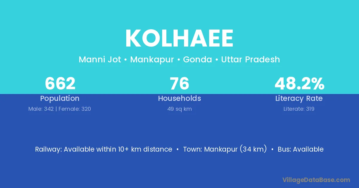 Mankapur (34 km) is the nearest town to Kolhaee village for major economic activities and is located approximately 34 km away.