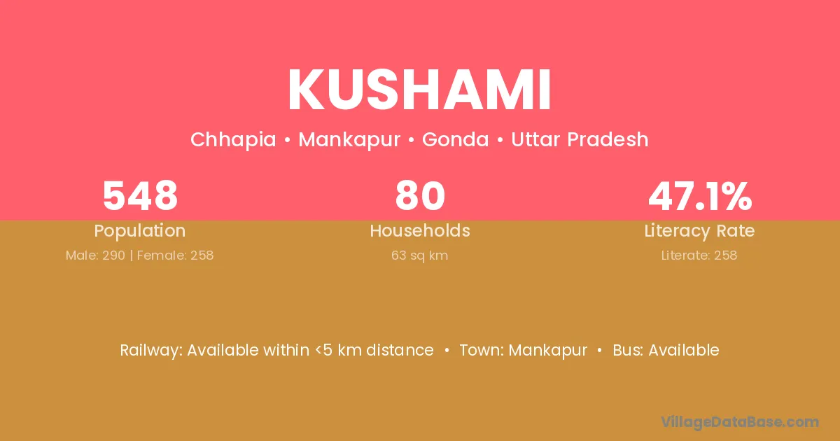 Kushami village has a total population of 548 people, of which 290 are males and 258 are females.