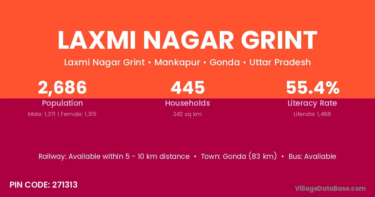 Gonda (83 km) is the nearest town to Laxmi Nagar Grint village for major economic activities and is located approximately 83 km away.
