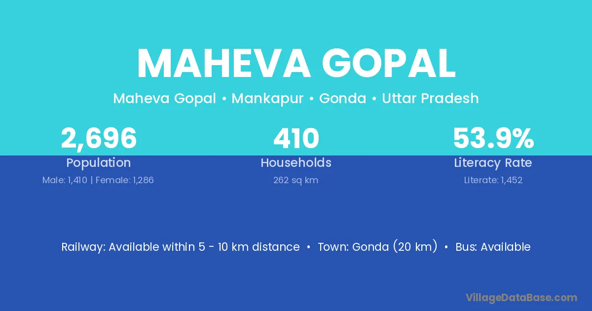 Gonda (20 km) is the nearest town to Maheva Gopal village for major economic activities and is located approximately 20 km away.