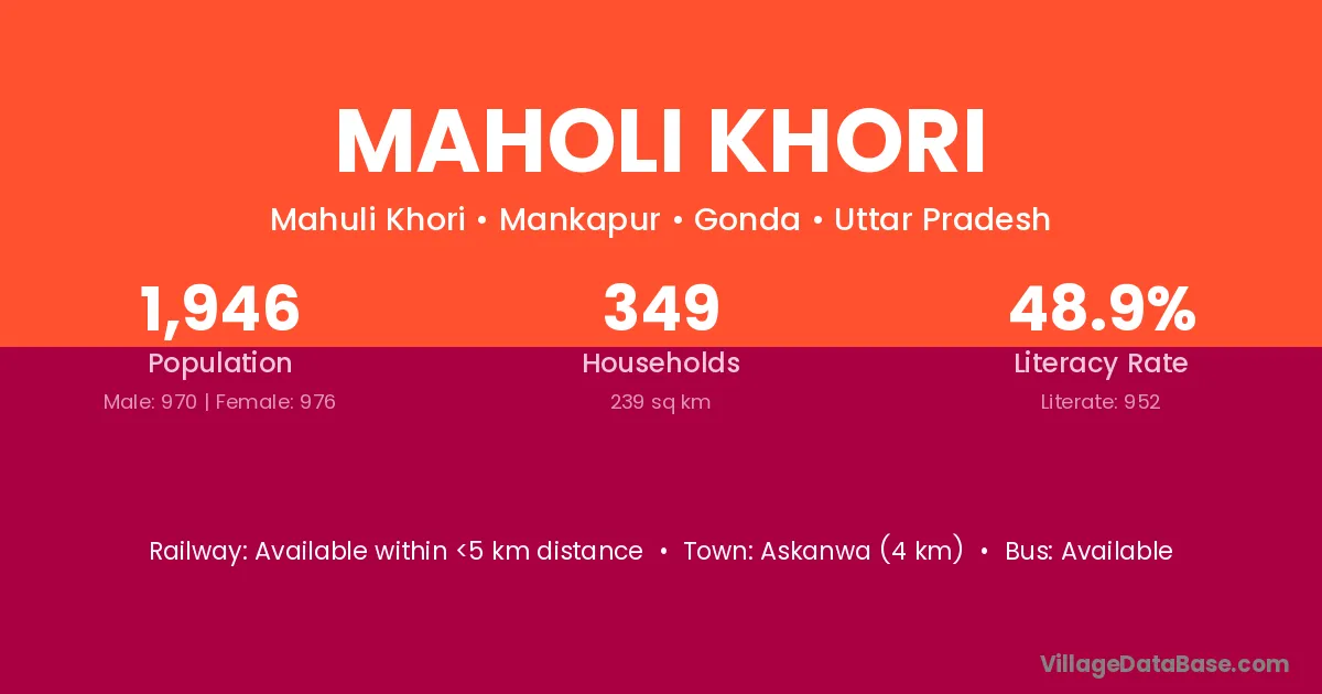 Maholi Khori village has a total population of 1,946 people, of which 970 are males and 976 are females.