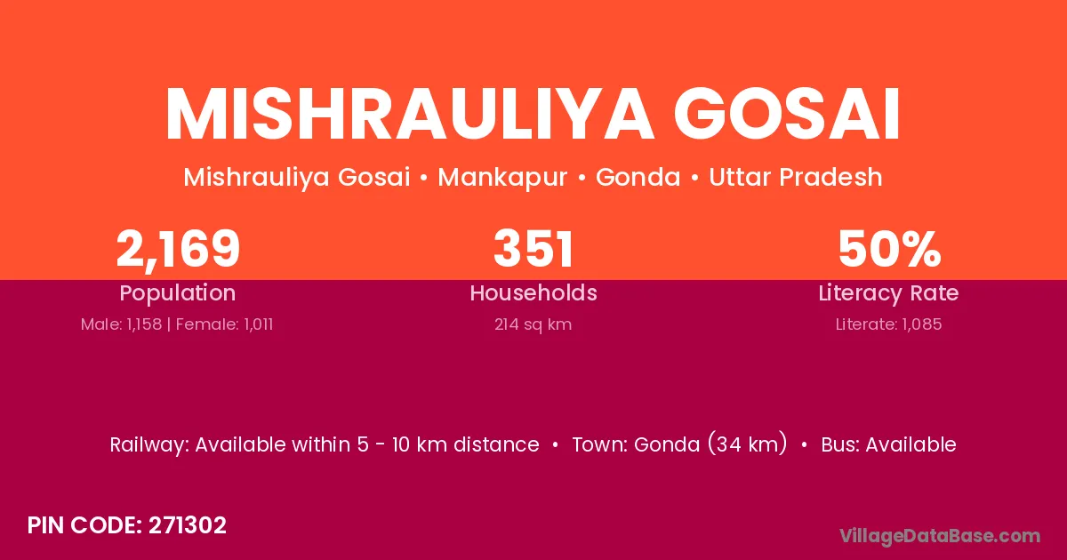 Gonda (34 km) is the nearest town to Mishrauliya Gosai village for major economic activities and is located approximately 34 km away.