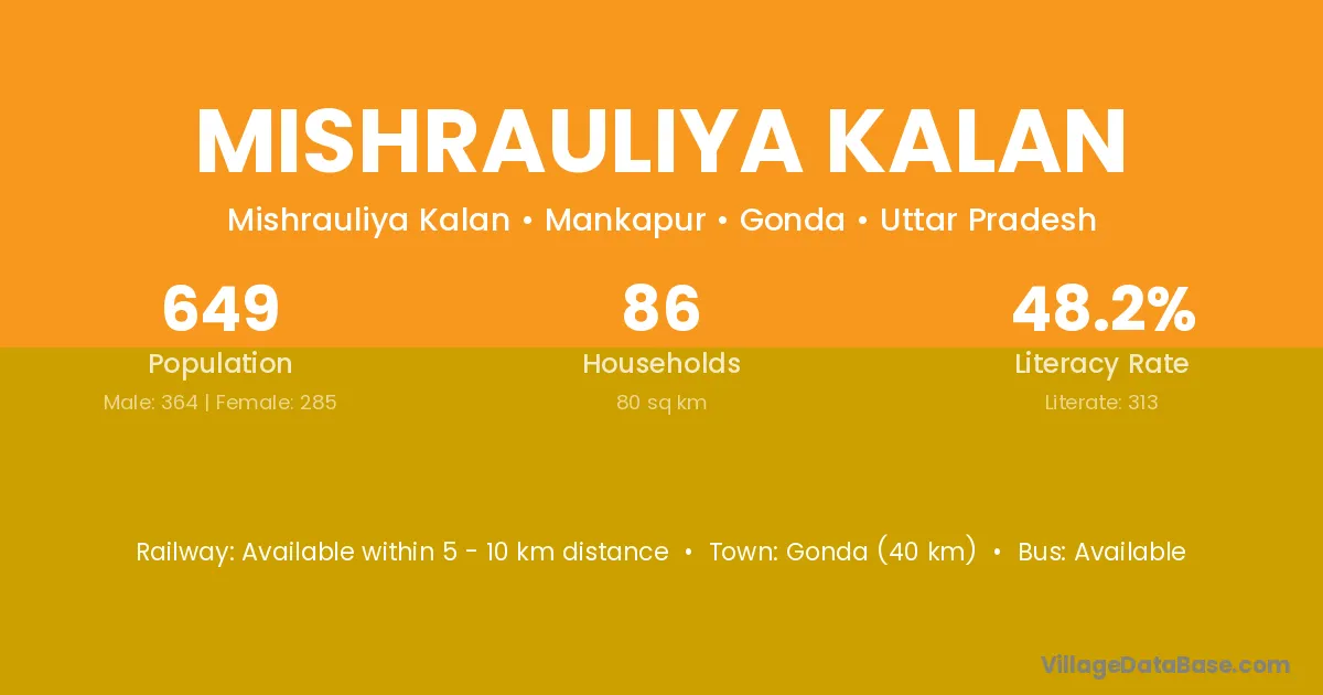 Gonda (40 km) is the nearest town to Mishrauliya Kalan village for major economic activities and is located approximately 40 km away.