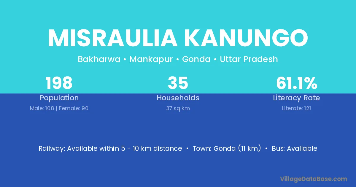 Gonda (11 km) is the nearest town to Misraulia Kanungo village for major economic activities and is located approximately 11 km away.