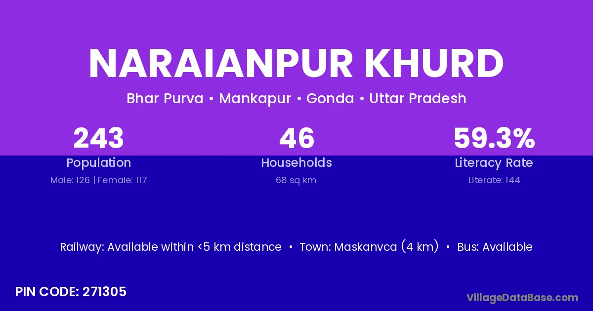 Naraianpur Khurd village has a total population of 243 people, of which 126 are males and 117 are females.