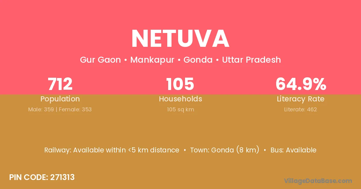 Gonda (8 km) is the nearest town to Netuva village for major economic activities and is located approximately 8 km away.
