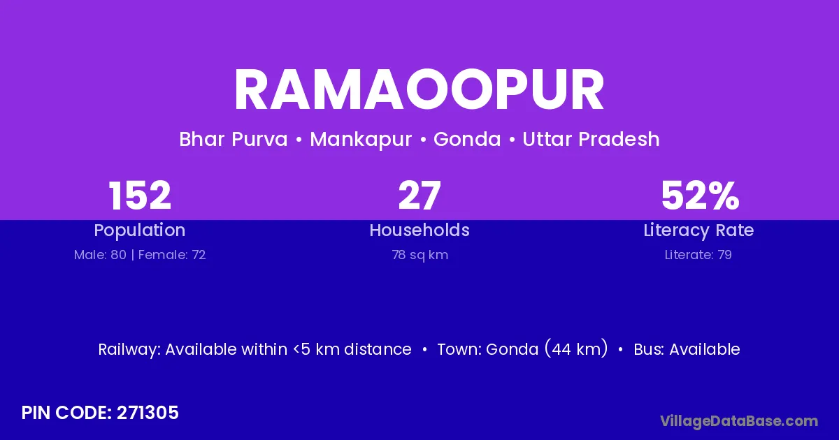 Gonda (44 km) is the nearest town to Ramaoopur village for major economic activities and is located approximately 44 km away.