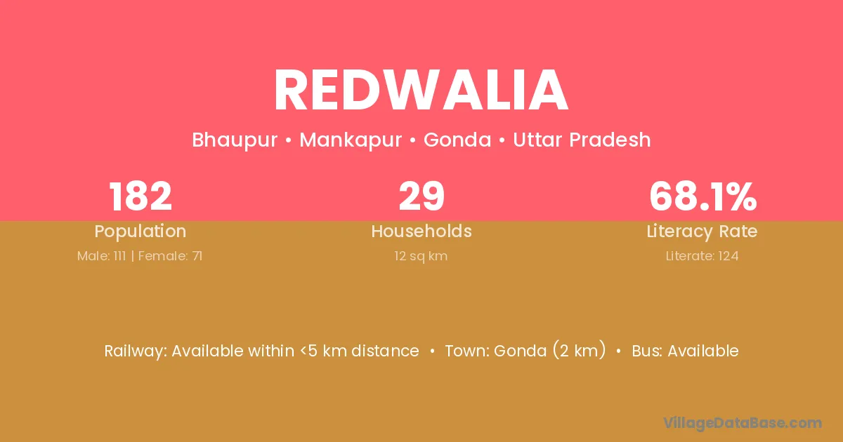 Gonda (2 km) is the nearest town to Redwalia village for major economic activities and is located approximately 2 km away.
