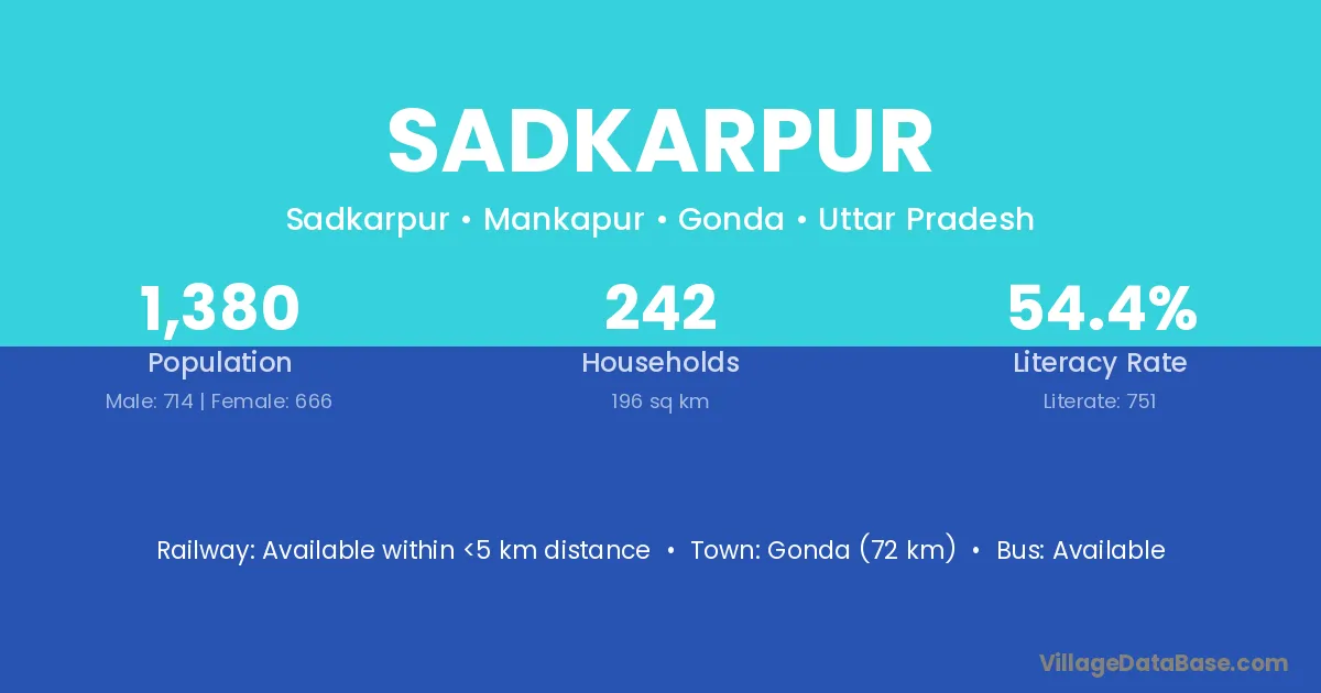 Gonda (72 km) is the nearest town to Sadkarpur village for major economic activities and is located approximately 72 km away.