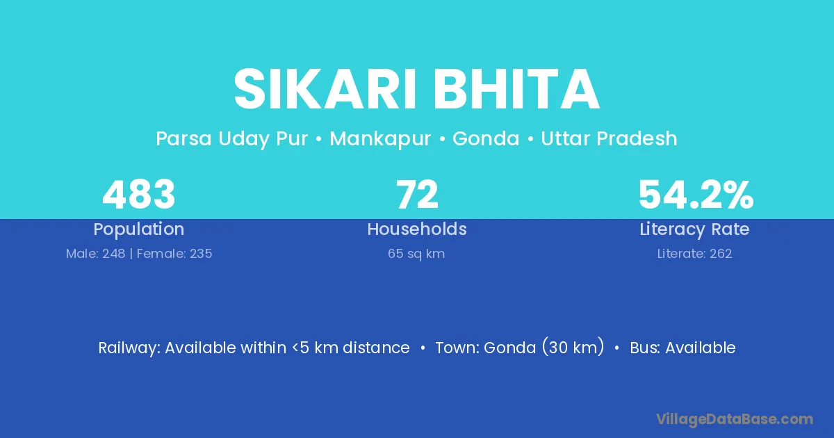 Gonda (30 km) is the nearest town to Sikari Bhita village for major economic activities and is located approximately 30 km away.