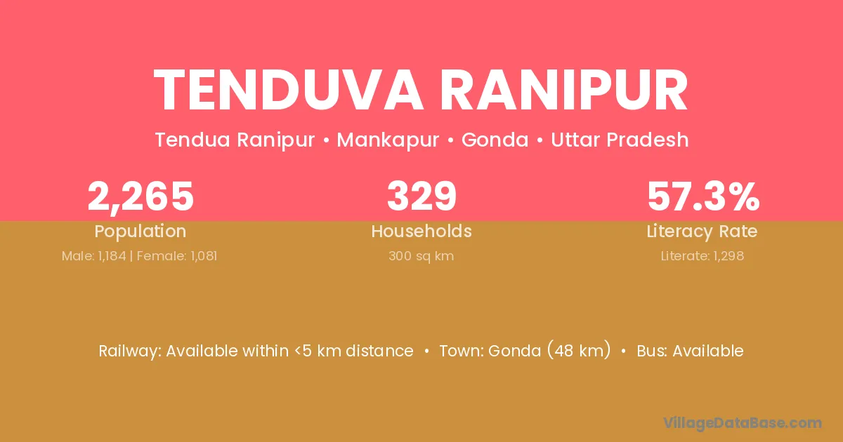 Gonda (48 km) is the nearest town to Tenduva Ranipur village for major economic activities and is located approximately 48 km away.