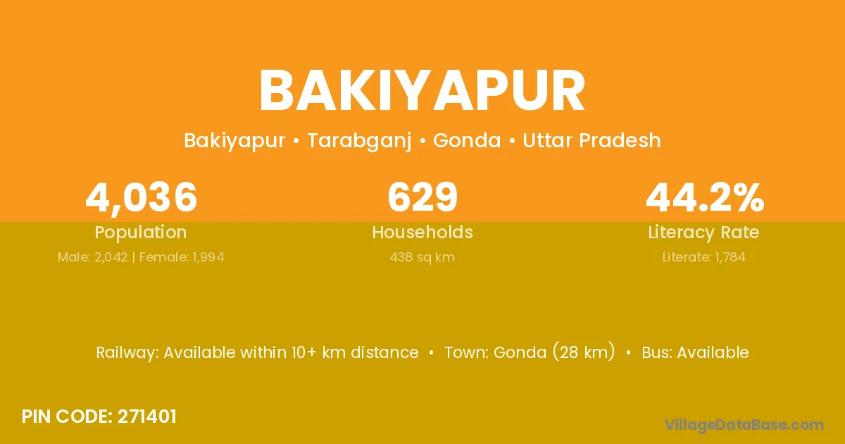 Gonda (28 km) is the nearest town to Bakiyapur village for major economic activities and is located approximately 28 km away.