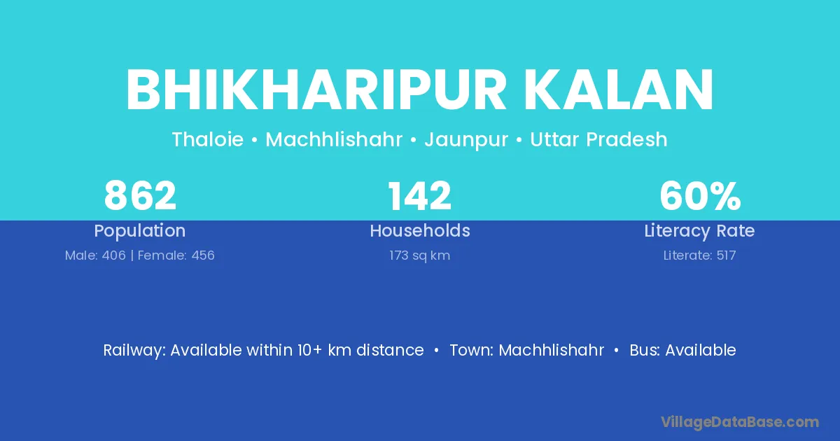 The literacy rate of Bhikharipur Kalan village is 46.28%. Male literacy stands at 58.01% and female literacy at 33.75%.