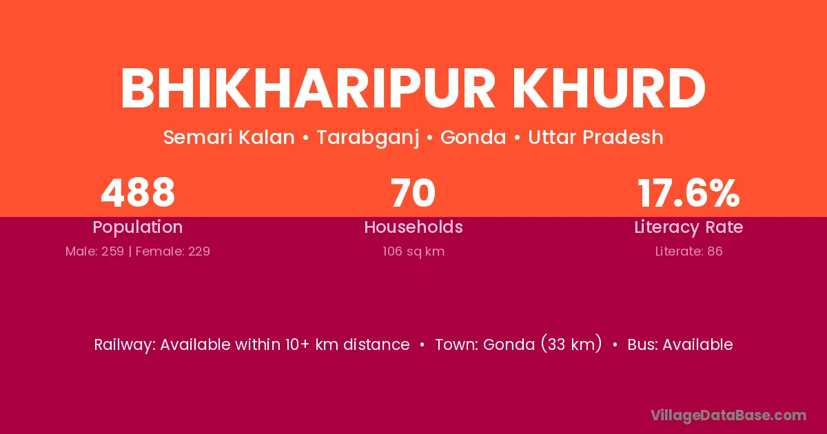 Gonda (33 km) is the nearest town to Bhikharipur Khurd village for major economic activities and is located approximately 33 km away.