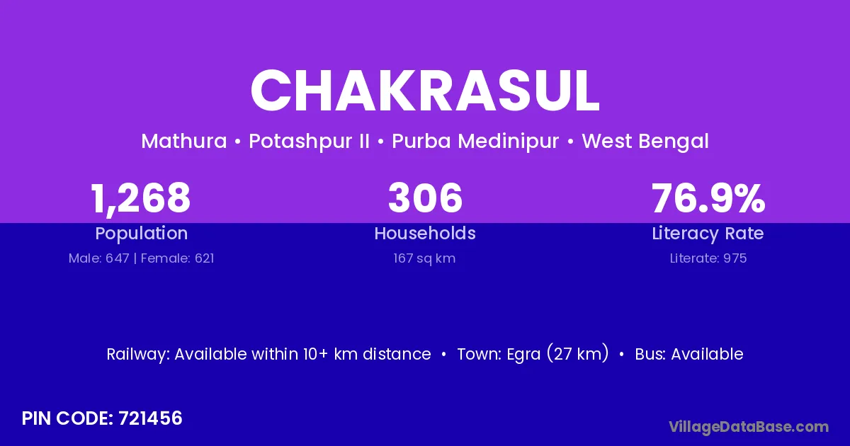 The literacy rate of Chakrasul village is 37.18%. Male literacy stands at 48.51% and female literacy at 23.74%.