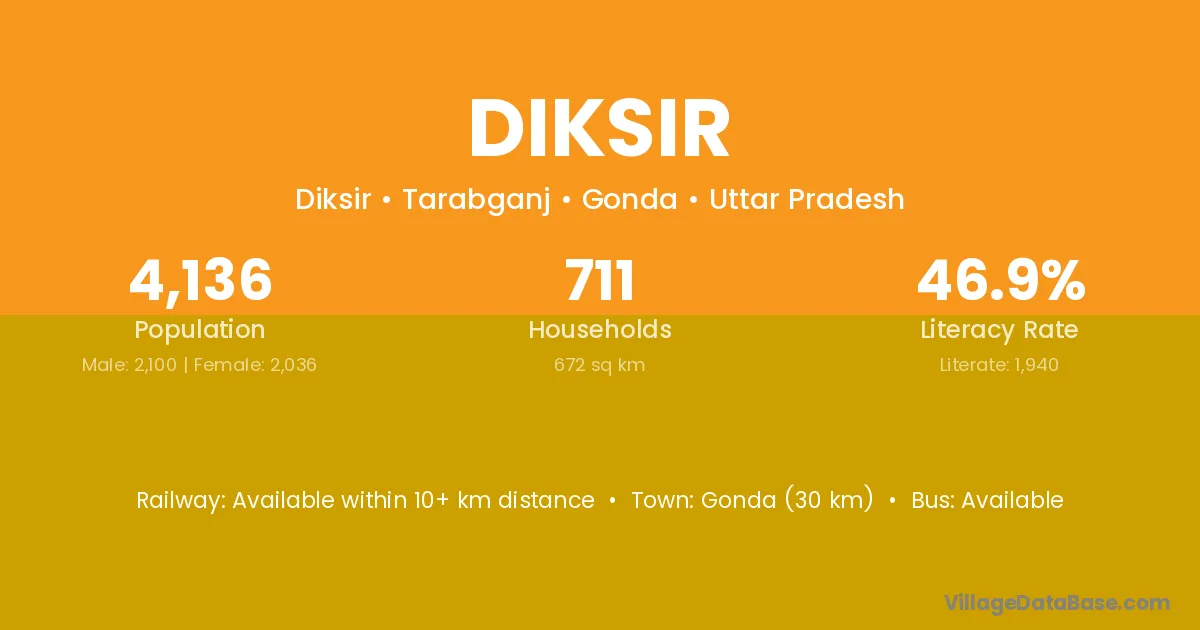 Gonda (30 km) is the nearest town to Diksir village for major economic activities and is located approximately 30 km away.