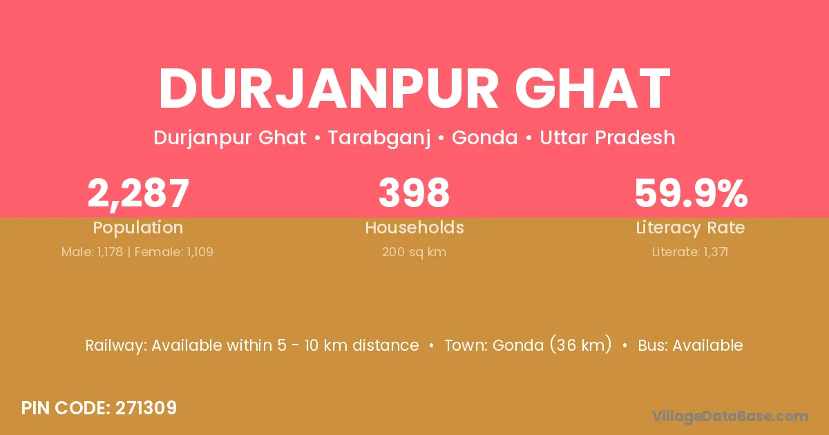 Gonda (36 km) is the nearest town to Durjanpur Ghat village for major economic activities and is located approximately 36 km away.