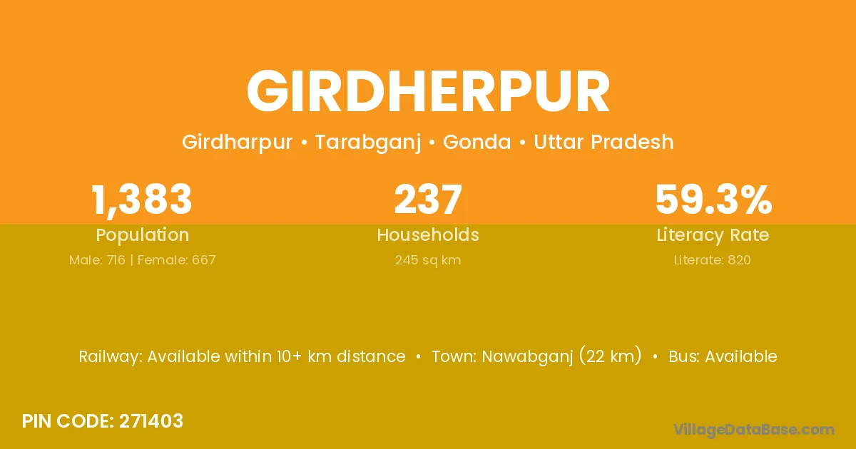 Nawabganj (22 km) is the nearest town to Girdherpur village for major economic activities and is located approximately 22 km away.