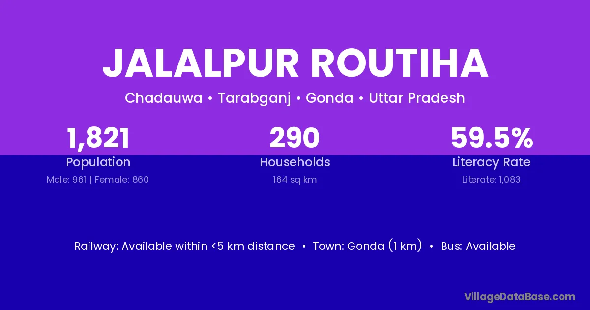 Gonda (1 km) is the nearest town to Jalalpur Routiha village for major economic activities and is located approximately 1 km away.