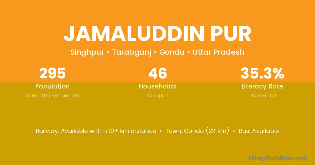 Gonda (22 km) is the nearest town to Jamaluddin Pur village for major economic activities and is located approximately 22 km away.