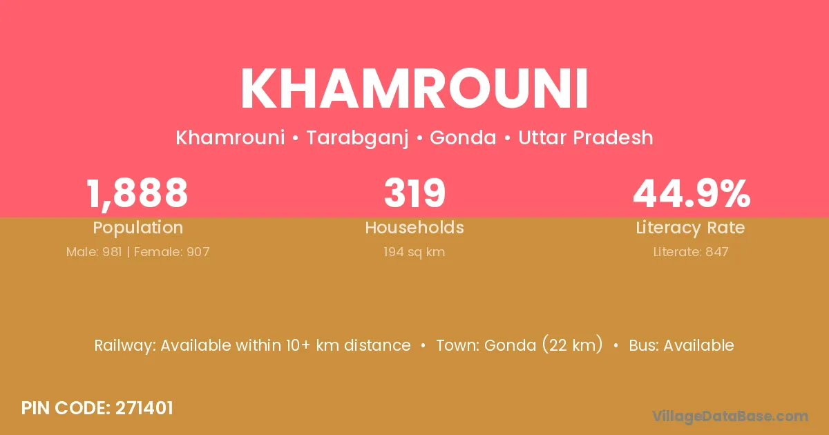 Gonda (22 km) is the nearest town to Khamrouni village for major economic activities and is located approximately 22 km away.