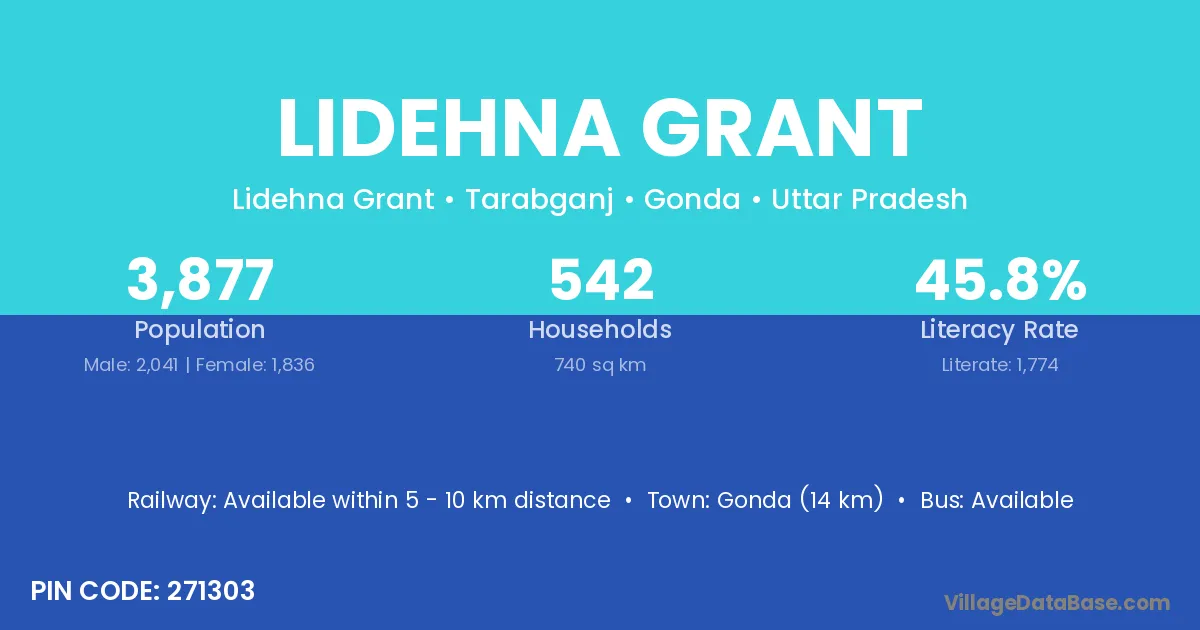 Gonda (14 km) is the nearest town to Lidehna Grant village for major economic activities and is located approximately 14 km away.