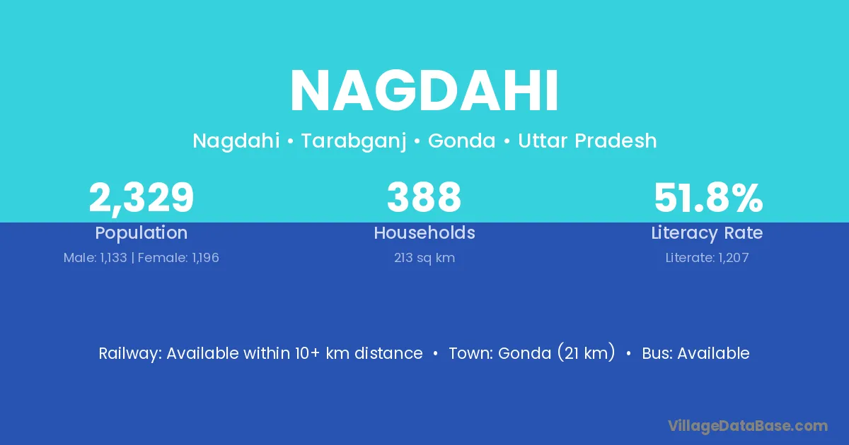Gonda (21 km) is the nearest town to Nagdahi village for major economic activities and is located approximately 21 km away.