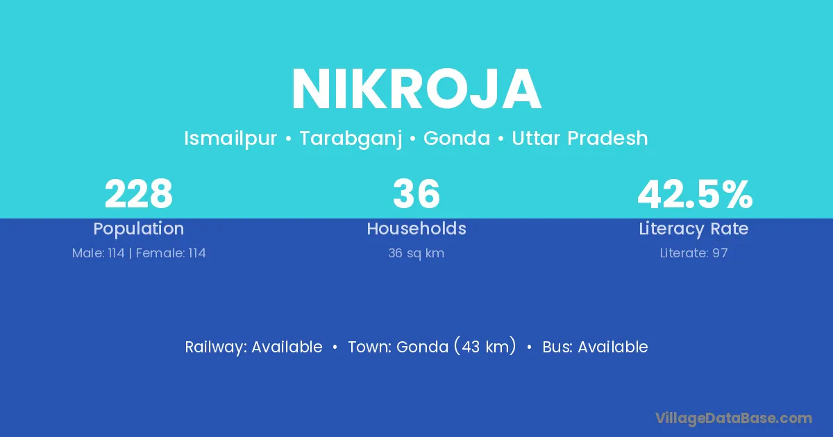 Gonda (43 km) is the nearest town to Nikroja village for major economic activities and is located approximately 43 km away.