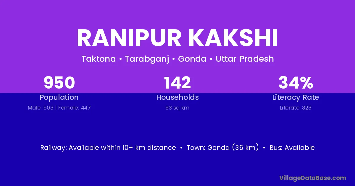 Gonda (36 km) is the nearest town to Ranipur Kakshi village for major economic activities and is located approximately 36 km away.