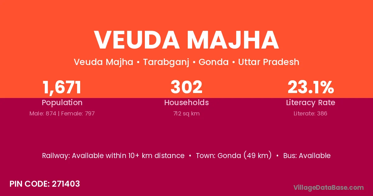 Gonda (49 km) is the nearest town to Veuda Majha village for major economic activities and is located approximately 49 km away.