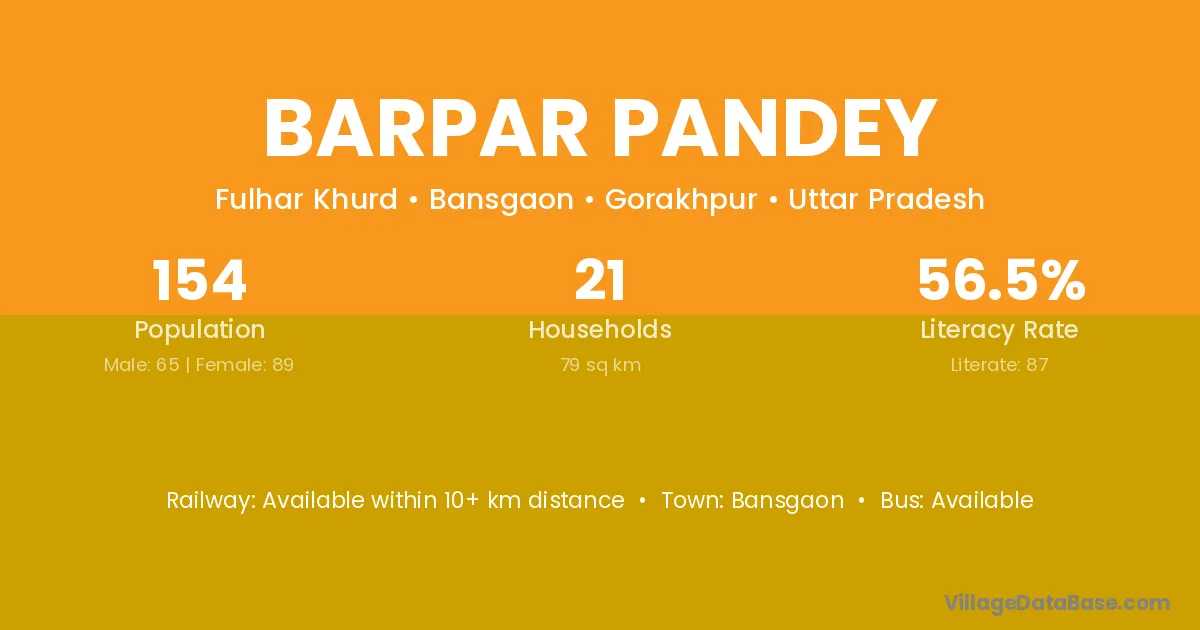 Barpar Pandey village has a total population of 154 people, of which 65 are males and 89 are females.