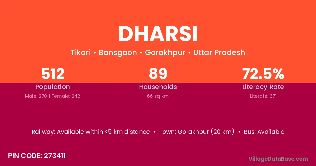 Dharsi village has a total population of 512 people, of which 270 are males and 242 are females.