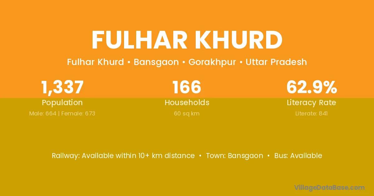 Fulhar Khurd village has a total population of 1,337 people, of which 664 are males and 673 are females.